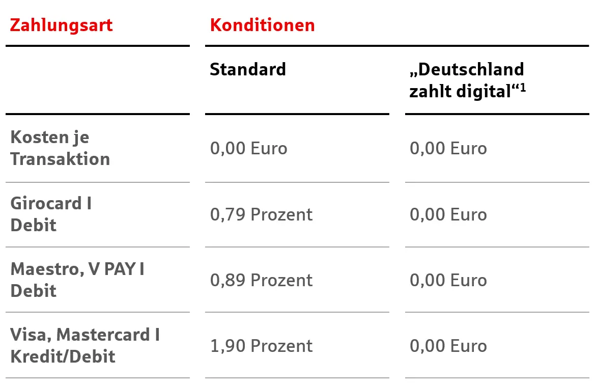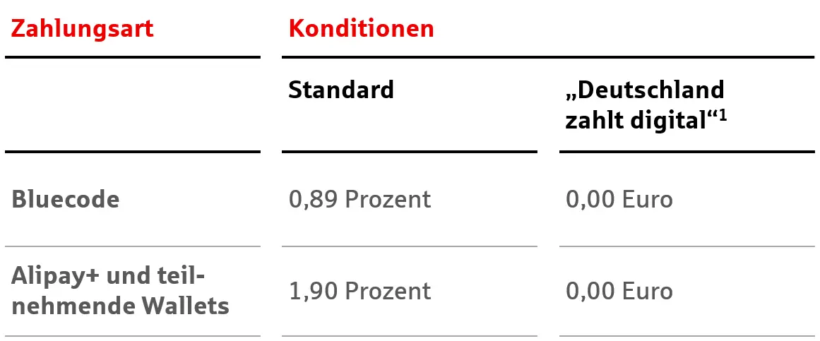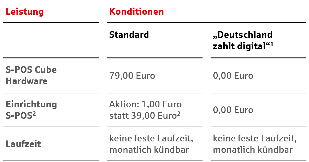 Die Tabelle zeigt die regulären S-POS Standard-Konditionen. Teilnahmeberechtigte Händlerinnen und Händler profitieren aktuell von der Initiative „Deutschland zahlt digital“, die den Einstieg ins bargeldlose Kassieren 12 Monate lang gratis ermöglicht.¹
