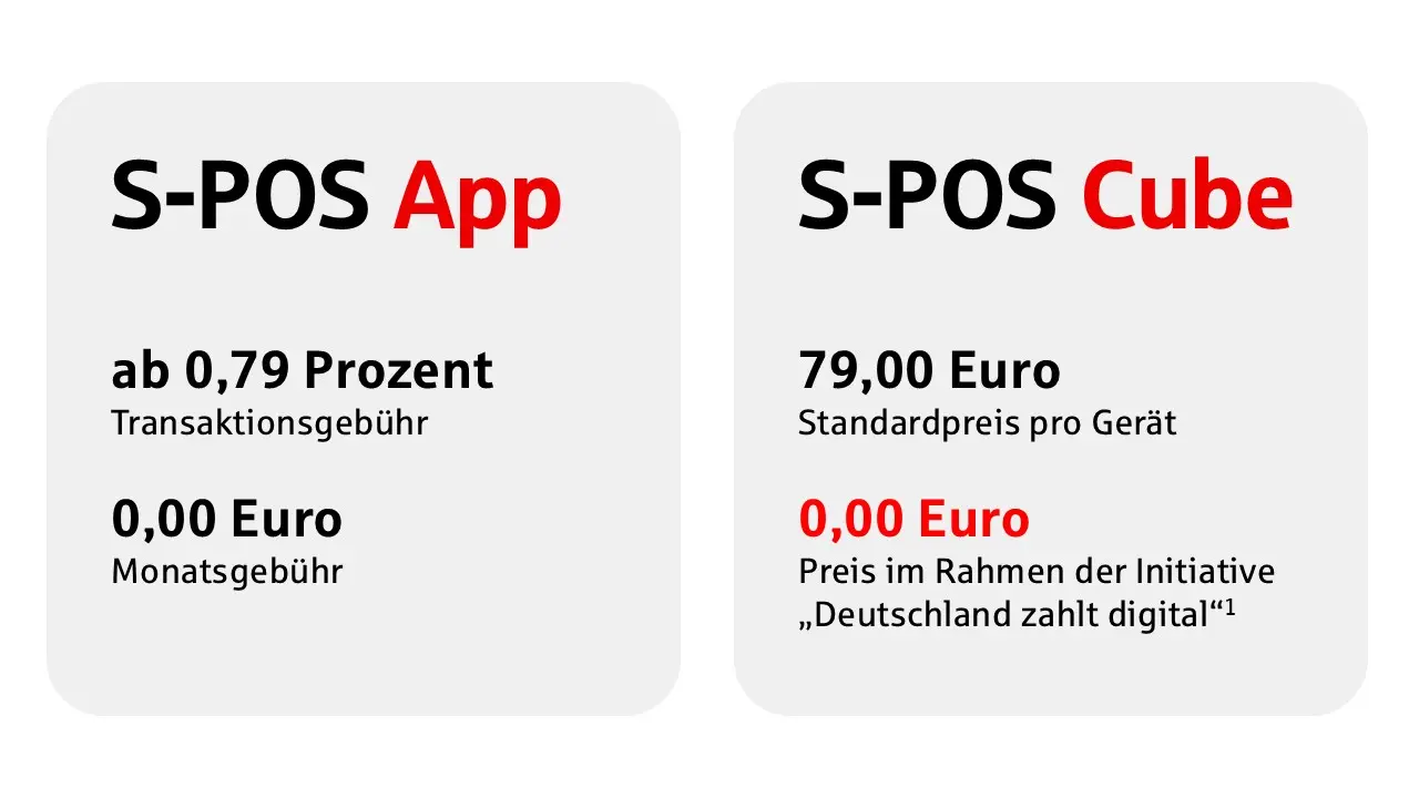 ¹ Im Rahmen der Initiative "Deutschland zahlt digital" (Dzd) ist die Nutzung der S-POS App bei Vertragsabschlüssen zwischen dem 16.06.2025 und 15.06.2026 sowie Einhaltung der Teilnahmebedingungen für 12 Monate kostenlos. Die Teilnahmebedingungen finden Sie hier. Wird der Vertrag nicht fristgerecht gekündigt, gelten ab dem 13. Monat folgende Konditionen: Transaktionsentgelte pro Zahlung: girocard (debit): 0,79 %, Maestro, V PAY (debit): 0,89 %, Visa, Mastercard (credit/debit): 1,90 % zzgl. 10 Ct. je Trans. lt. zzgl. den Konditionen des Preis- und Leistungsverzeichnisses. Die Kostenübernahme erfolgt bis zu einem Umsatz von 50.000 Euro resultierend aus digitalen Zahlungen. Bei höherem Umsatz können einzelne Kosten nicht voll übernommen werden. Ab dem 13. Monat oder bei Überschreiten der Umsatzergrenze gelten die vereinbarten S-POS-Konditionen und das geltende Preis- und Leistungsverzeichnis des S-Händlerservice (PAYONE).