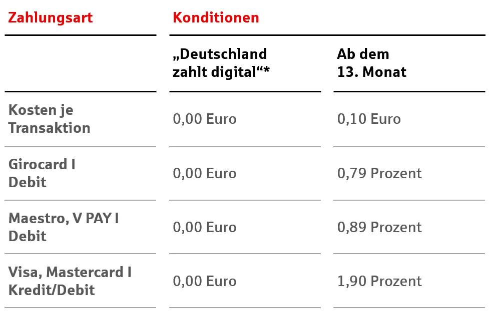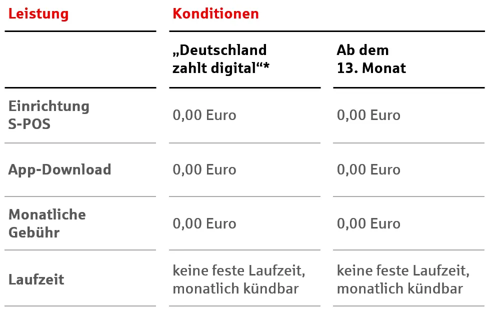 Die Tabelle zeigt die S-POS Konditionen im Rahmen der Initiative „Deutschland zahlt digital“.* Ab dem 13. Monat gelten die S-POS Standardkonditionen.